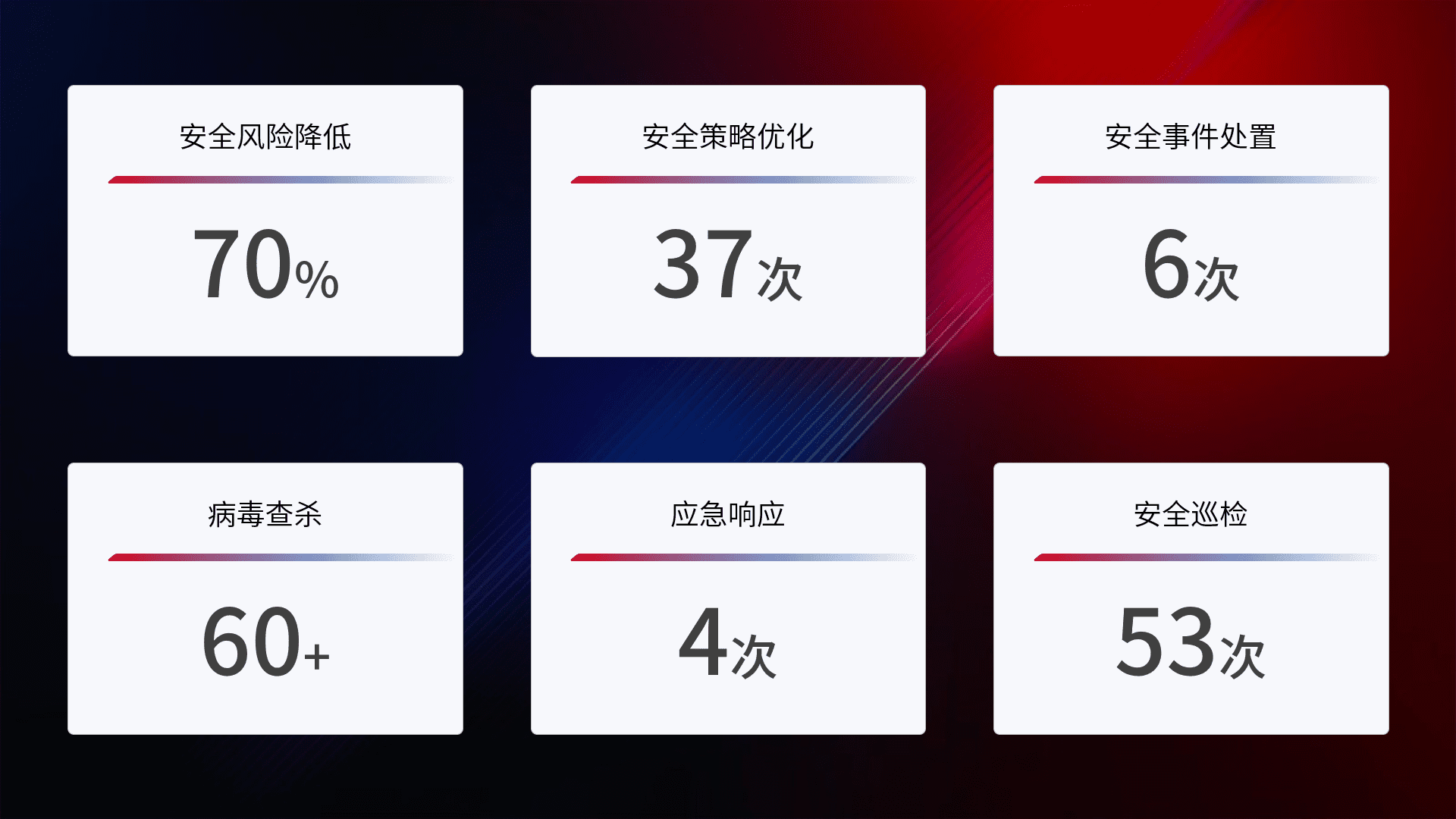提供全面的安全事件报告体系,,,包括处置报告、、、周报、、、季度和年度总结,,,结合持续监控,,,帮助客户深入了解网络安全状况。。